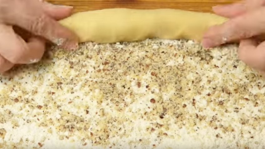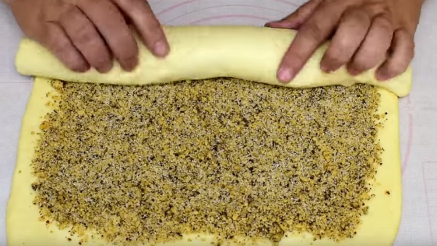 Рясно присипте його начинкою, а зверху - подрібненими волоськими горіхами. Потім скачайте в щільний рулет. За аналогією зробіть так зі ще двома частинами тіста.![]()