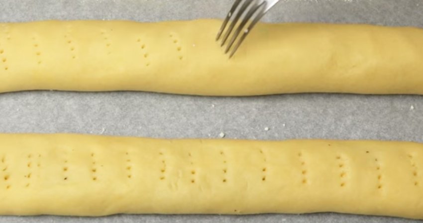 Деко застеліть папером для випічки і викладіть на нього готові рулети. Злегка притисніть їх, розплющуючи, а потім зробіть проколи виделкою через кожні 2-3 см.![]()