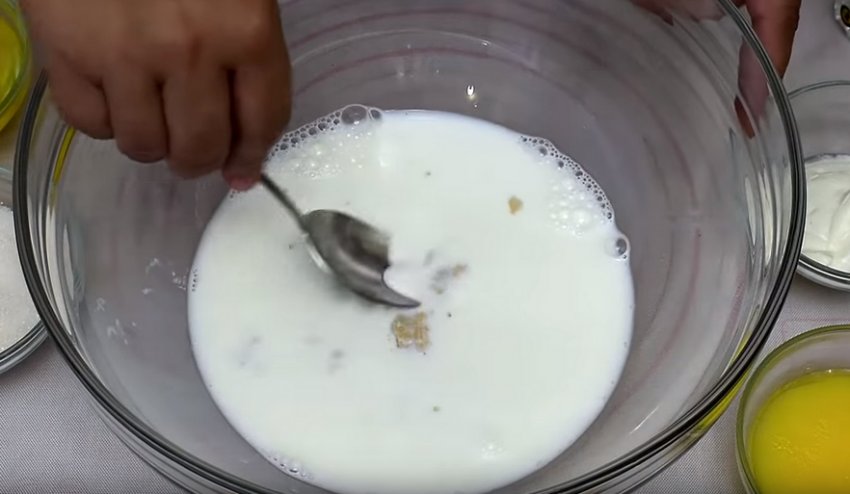 Вилийте в миску для тіста молоко і додайте дріжджі. Ретельно розмішайте до розчинення дріжджів.![]()