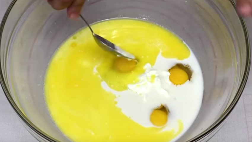 Яблука теж відправляються до жовтків і перемішуються.![]()