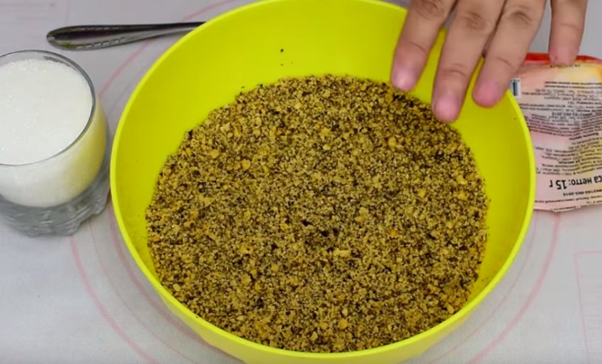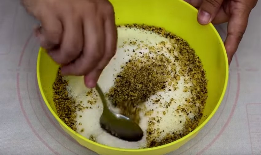 Волоські горіхи слід очистити від шкаралупи. Ядерця подрібнюються в блендері до стану крупинок, але не порошку.![]()
