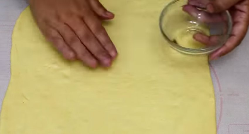 Зверху розкатаний пласт злегка змастіть рослинною олією, щоб надалі начинка добре скріпилася з тістом.![]()