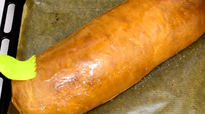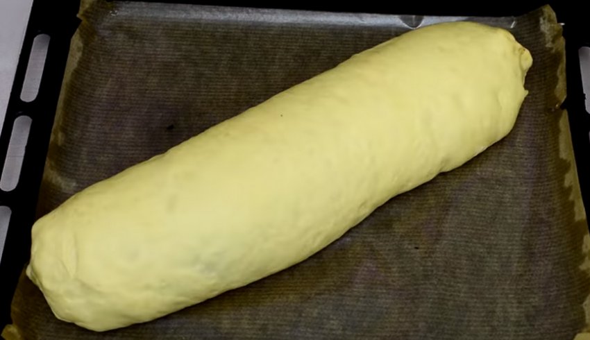 Викладіть рівномірним шаром начинку на тісто так, щоб від країв залишалося близько 3 см з вузьких боків, близько 1 см з широких. Потім згорніть у щільний рулет і защипніть краї з усіх боків.![]()