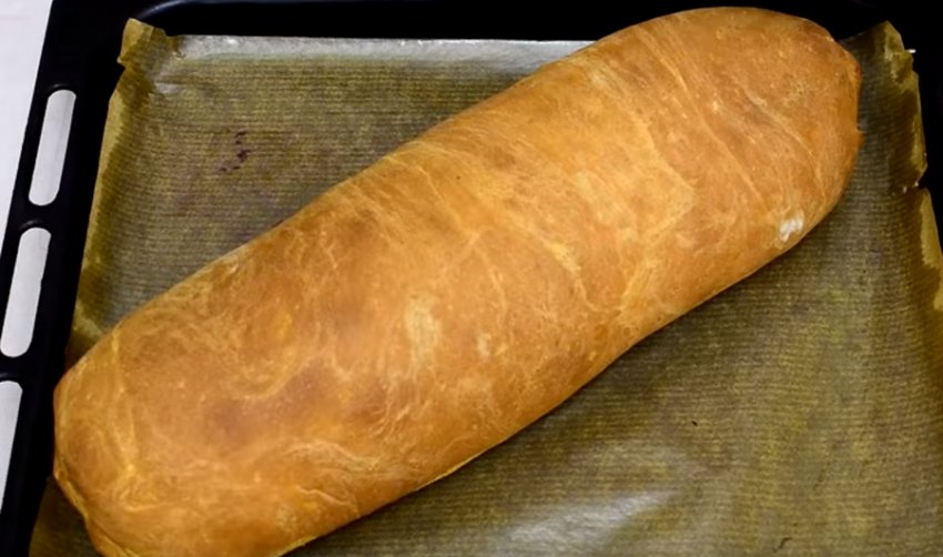 Після закінчення зазначеного часу відправте рулет у духовку. Вона має бути розігріта до +180°С. Час випікання - 30-40 хвилин. Якщо ви побачите, що рулет швидко став золотистим, укрийте його зверху папером і продовжуйте випікання до готовності.![]()