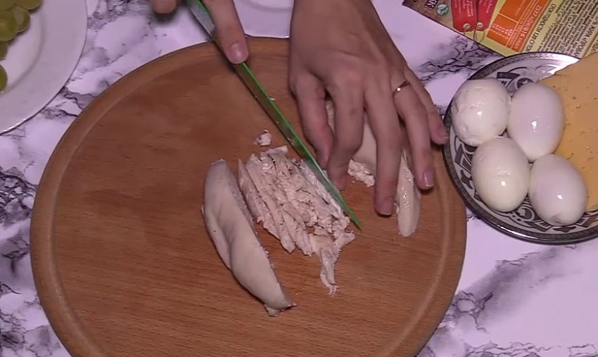 Дрібно нарізати курку. Викласти її шаром на дно блюда.![]()