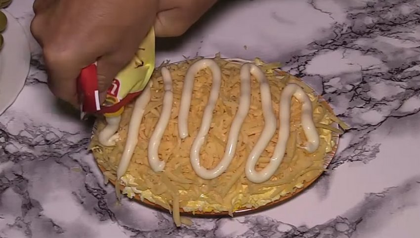 На дно страви викласти шар тертого білка. Злегка підсолити. Змастити тонким шаром майонезу.![]()