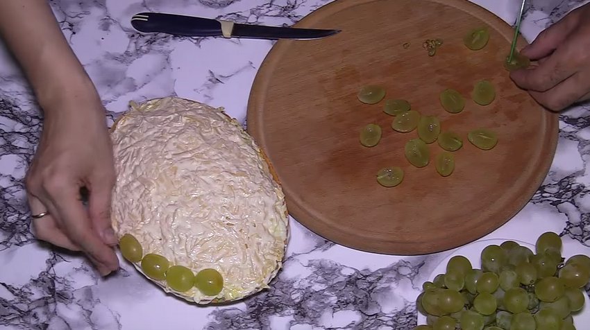 Виноград розділити на половинки. Вниз м'якоттю укласти його поверх заготовки.![]()