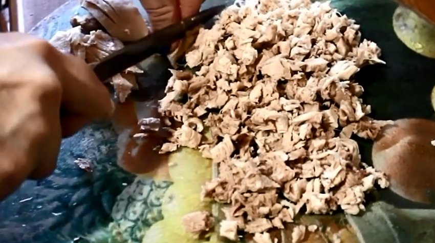 Курку нарізати кубиками або розділити на волокна (порвати руками).![]()