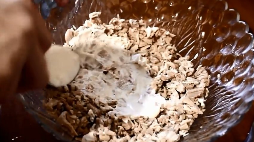 Викласти шар курячого м'яса. Змастити майонезом.![]()