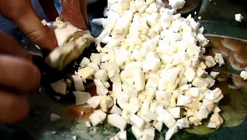 Нашаткувати кубиками яйця. Укласти їх поверх курки і нанести майонезно-часникову масу.![]()