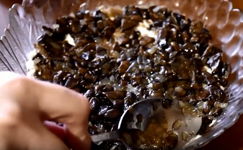 Натерти сир на крупну тертку. Викласти поверх грибів, покрити майонезною заправкою.![]()