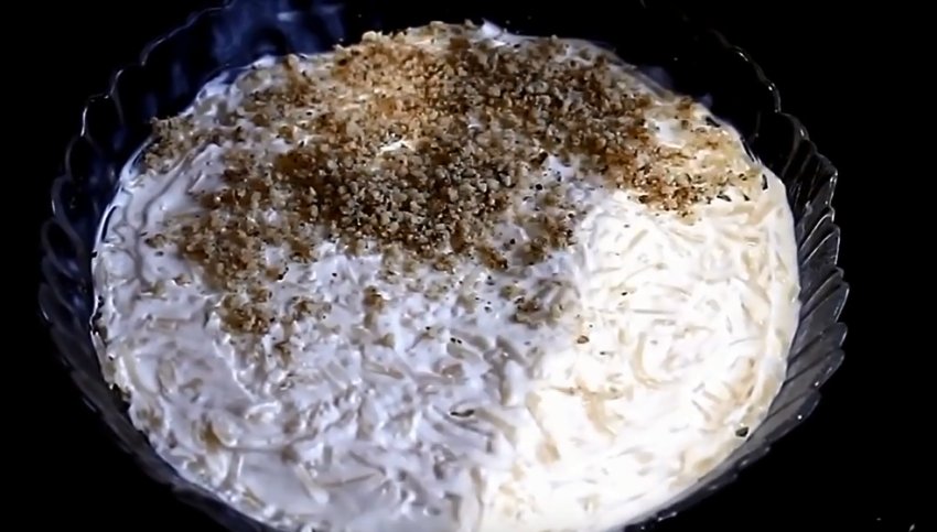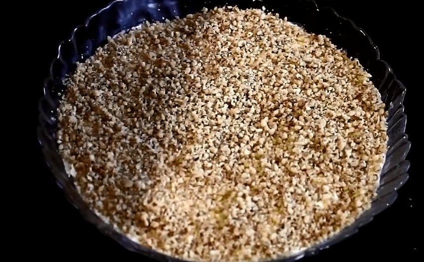 Поверх жовтків майонез наносити не потрібно. На поверхню цього шару насипати горіхи.![]()