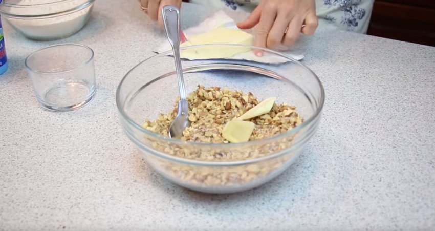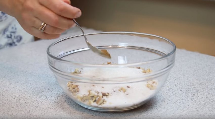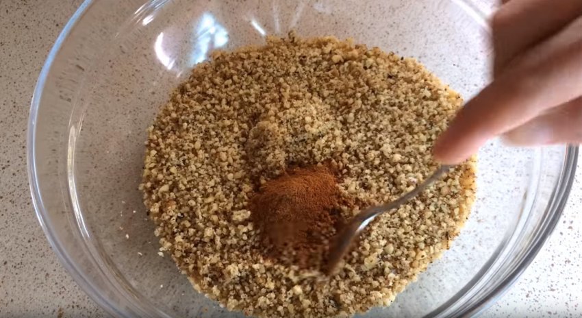 Узяти попередньо обсмажені волоські горіхи, дочекатися, поки вони охолонуть, і розкачати за допомогою качалки. До посічених горіхів потрібно додати цукор у кількості 100 грамів і корицю. Усі інгредієнти добре перемішати між собою.![]()