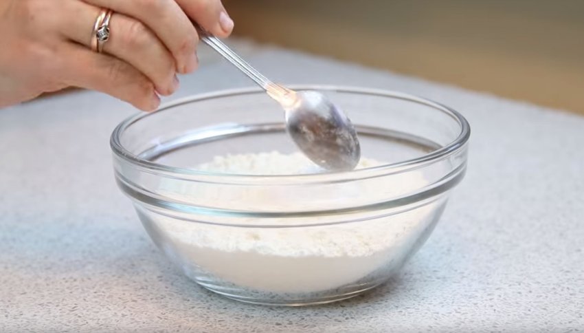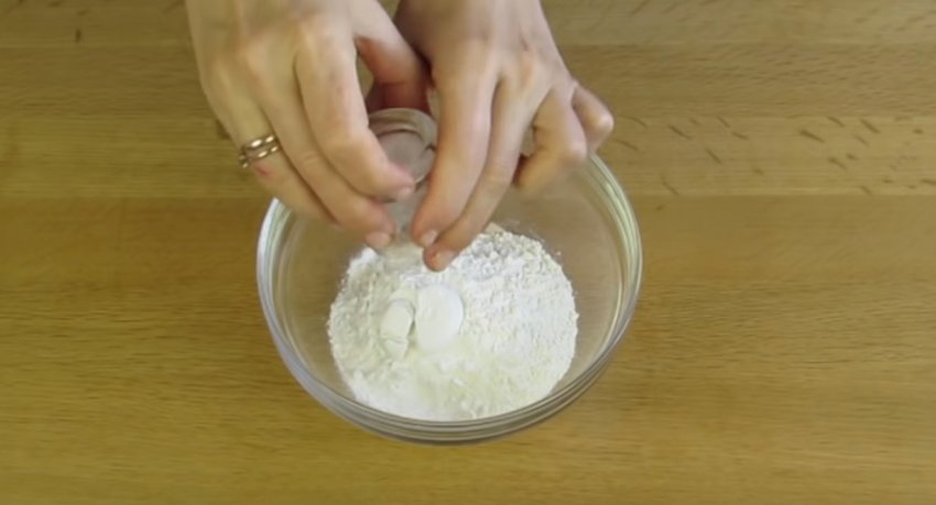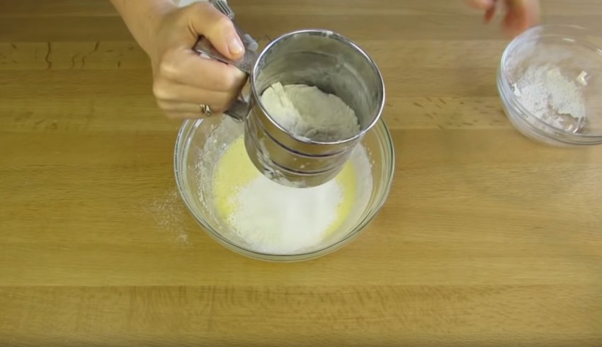 Для приготування тіста взяти борошно в кількості 250 г і сюди ж всипати розпушувач. Інгредієнти максимально ретельно перемішати між собою, щоб розпушувач зміг розподілитися по всьому об'єму борошна. Після цього суміш просіяти через сито.![]()