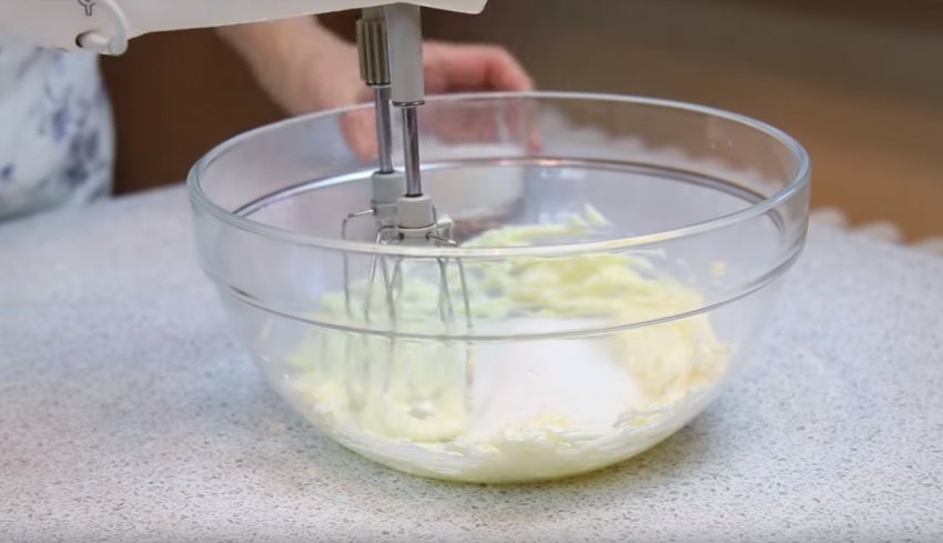 Підготувати вершкове масло в кількості 100 г, яке попередньо слід вийняти з холодильника, щоб воно стало досить м'яким, а цукор з ваніліном потрібно додати до масла і збити за допомогою міксера.![]()