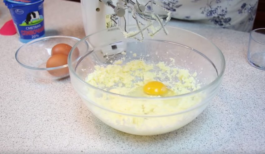 - Вершкове масло нарізати ножем на невеликі шматочки, додати в миску і змішати з сухою сумішшю. Бажано перетерти все в крихту за допомогою рук. Сюди ж додати сметану з яйцем і все ще раз добре перемішати та вимісити еластичне й гладке тісто.