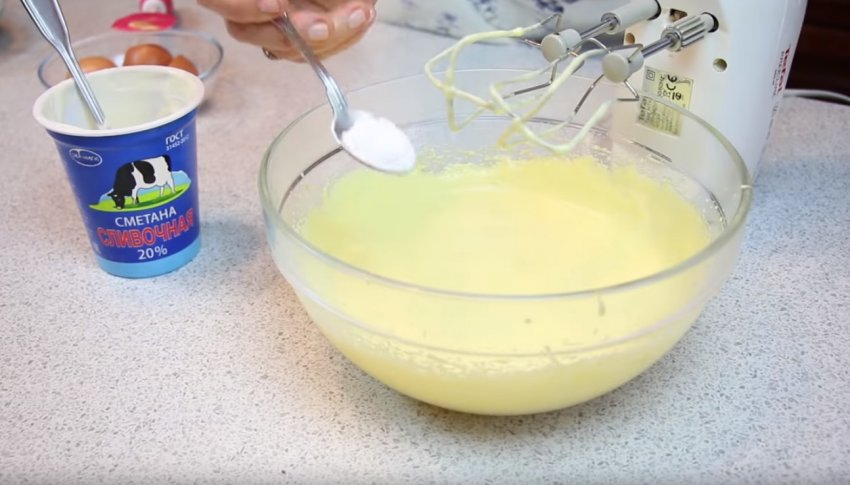 У практично готове тісто додати харчову соду, яка спільно з кислим середовищем сметани буде вступати в реакцію, за рахунок чого в процесі випікання тісто добре підніметься і повністю пропечеться.![]()