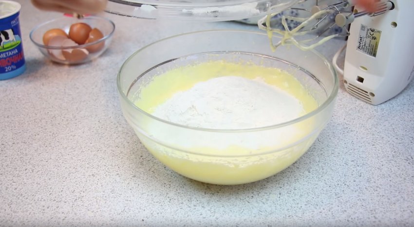 У суміш додати всі яйця. Бажано вмішувати їх по одному, і після кожного доданого компонента доводити майбутнє тісто до однорідності. Щоб воно добре перемішалося, періодично прибирайте його зі стінок посудини.У тісто вмішати сметану і збити за допомогою міксера до однорідності.![]()
