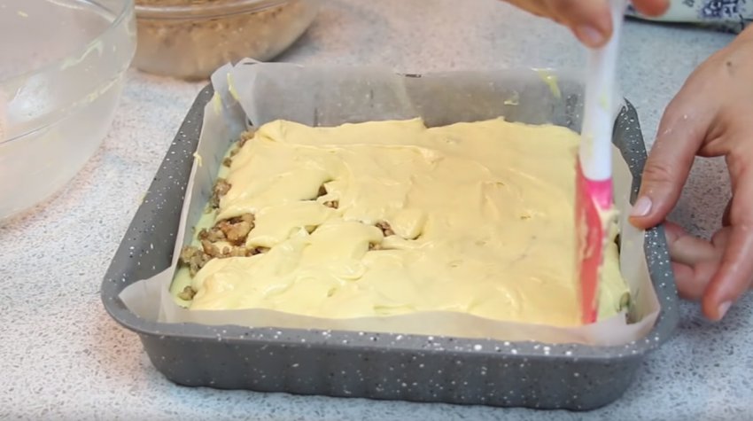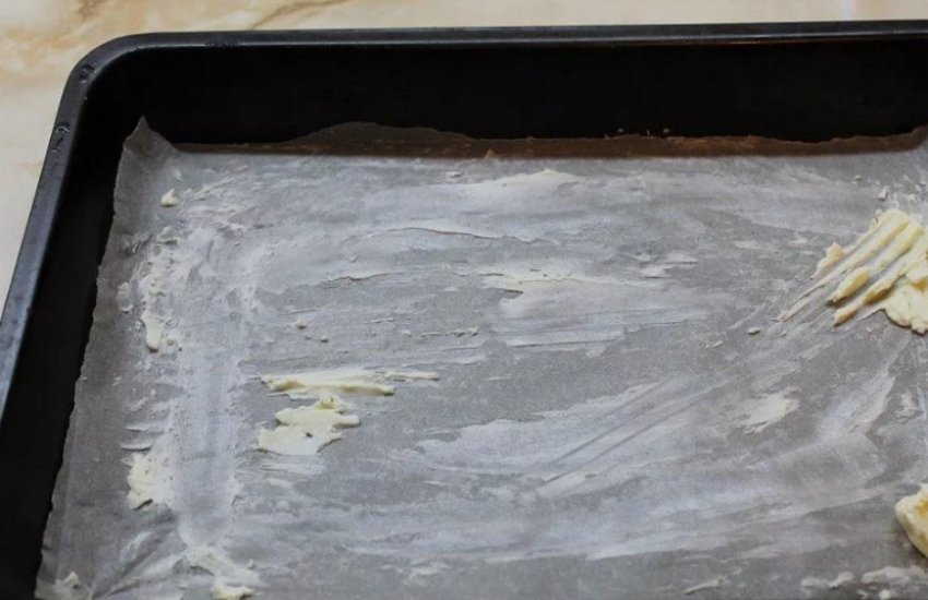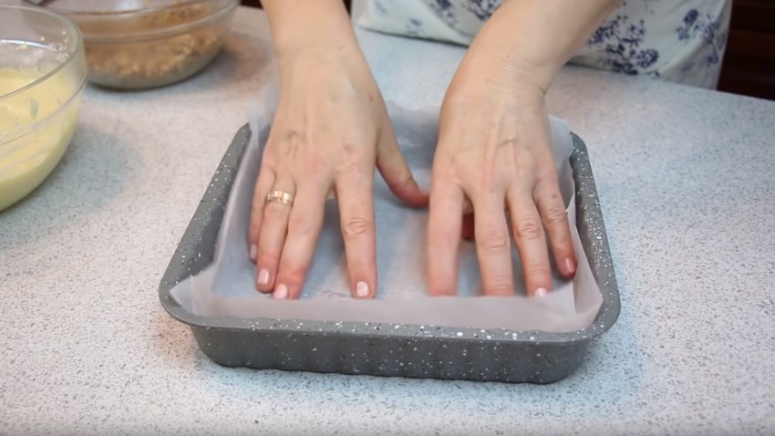 Для випікання потрібно взяти форму квадратної форми, розміри якої приблизно становлять 21×21 см. Замість квадратної форми може підійти і кругла, але з діаметром 24 см. Потім вистелити її дно за допомогою пергаменту.![]()