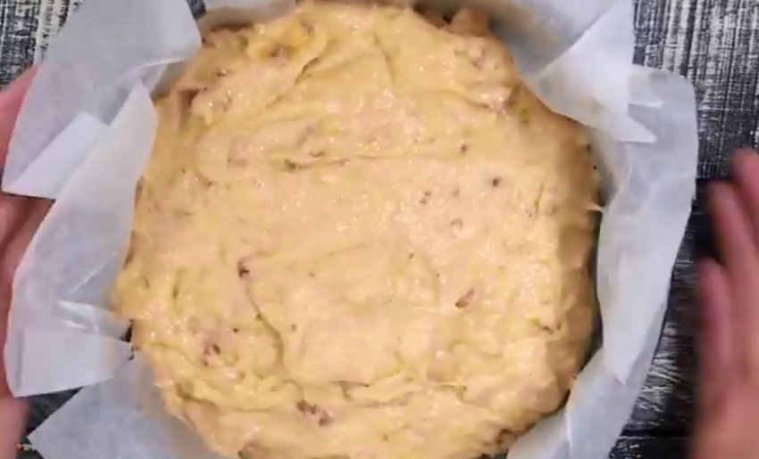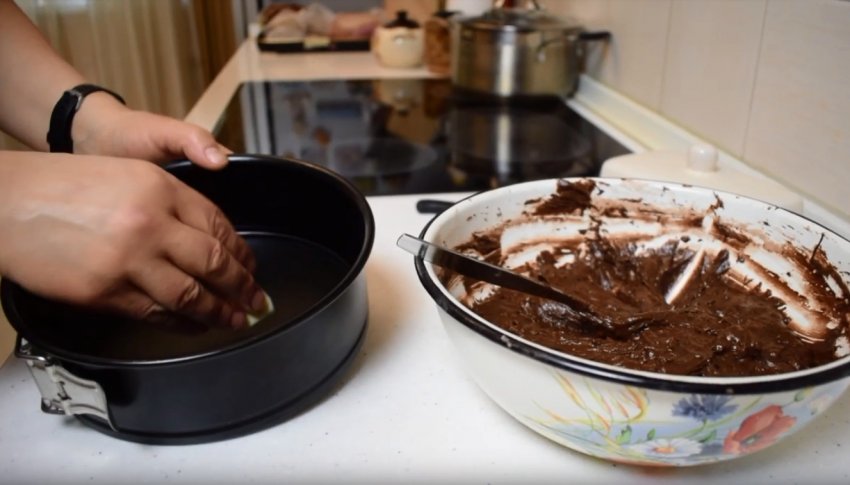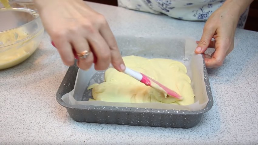 - Взяти форму для випікання, змастити дно і стінки вершковим маслом або ж вистелити пергаментом. Потім викласти тісто і розподілити його так, щоб воно рівномірно розподілилося по всій поверхні.