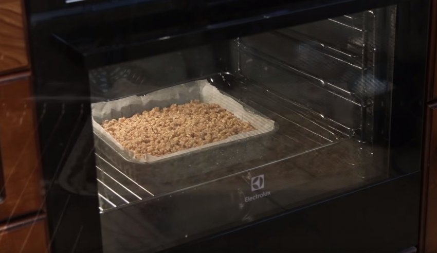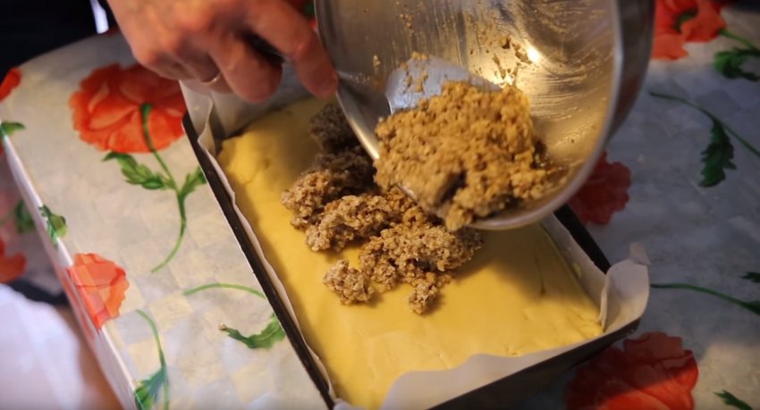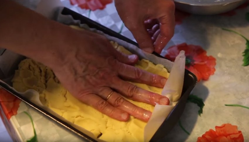 Після отримання тіста взяти невелику прямокутну форму, застелити її пергаментом і розкласти по дну отриману пісочну суміш.![]()