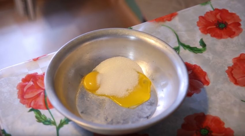 Далі в миску розбити яйце, яке збити за допомогою вінчика, але краще взяти міксер. Не припиняючи процес збивання, потрібно поступово ввести цукор. Виконувати ці дії доти, доки не вийде пишна світла маса. Для цього знадобиться близько 2-3 хвилин.![]()