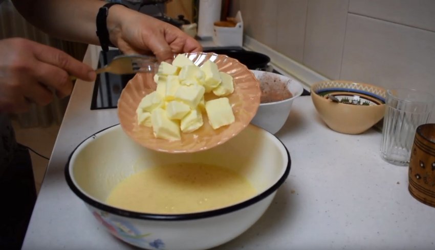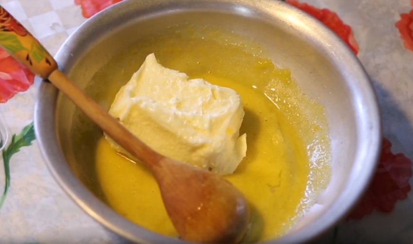 - В отриману суміш влити вершкове масло, яке попередньо розтопити на водяній бані, і все добре перемішати.