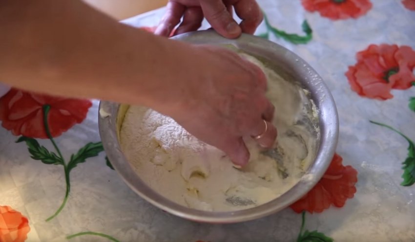 У готову суміш додати сметану і все ще раз перемішати. Борошняну суміш, яка була отримана раніше, просіяти в сметано-яєчну заготовку і вимісити до отримання тіста. Головне, щоб воно вийшло максимально м'яким і однорідним.![]()