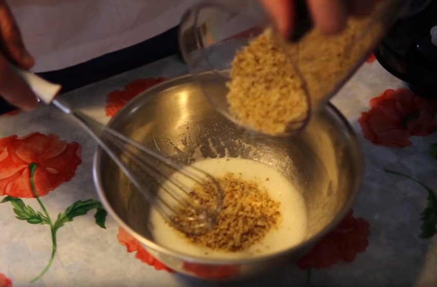 Щоб приготувати горіхову начинку, потрібно взяти горіхи і подрібнити їх, але не до стану борошна. До білків, що залишилися, додати цукор у кількості 2 ст. л., після чого збити масу максимально ретельно. Сюди ж підмішати перемелені горіхи.![]()
