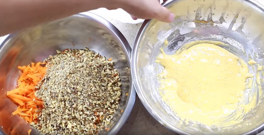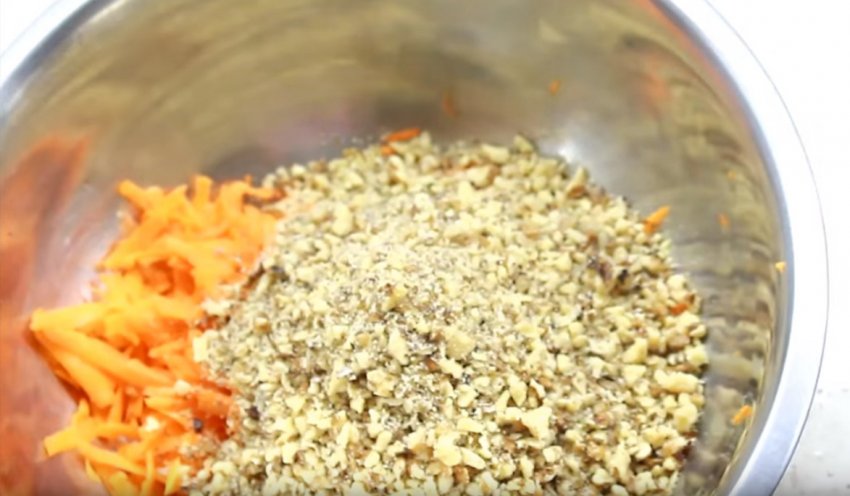 На попередньому етапі необхідно підготувати всі інгредієнти, а саме: моркву натерти на крупну тертку, волоський горіх перемолоти в блендері, жовтки відокремити від білків і натерти лимонну цедру. Натерту моркву слід ретельно змішати з волоським горіхом.![]()