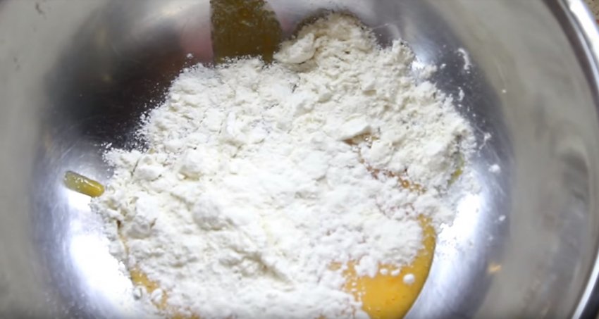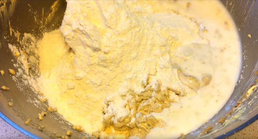 - Після цього потрібно акуратно підмішувати борошно з розпушувачем доти, доки не вийде однорідна маса.