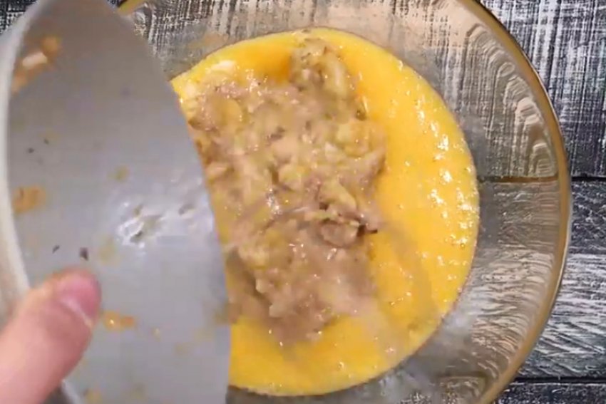 Цукор і яйця перемішати між собою. У яєчно-цукрову суміш додати попередньо розтоплене вершкове масло і подрібнені банани.![]()