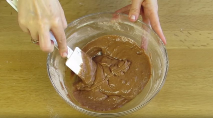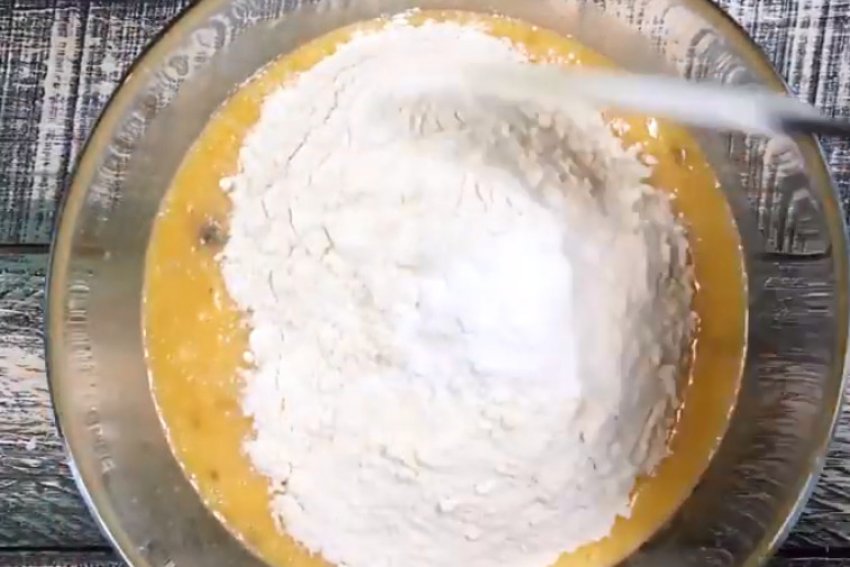 На останньому етапі в суміш додати борошно з розпушувачем і все ще раз добре розмішати, поки не зникнуть грудки.![]()