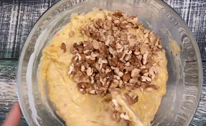 - В отримане тісто додати волоські горіхи, попередньо подрібнені на дрібні шматочки.