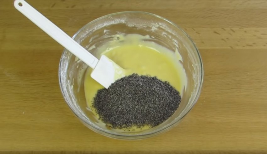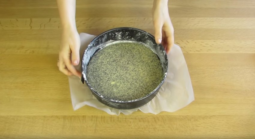 Тісто з маком покласти в круглу форму діаметром на 24 см, змастивши стінки олією та присипавши борошном, а дно форми накрити пергаментом. У ємності тісто розподілити та поставити випікатися в духовку, розігріту до +170°С, до того моменту, поки воно стане рум'яним і готовим. Для цього знадобиться 25 хвилин.![]()