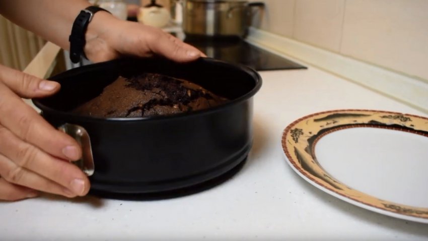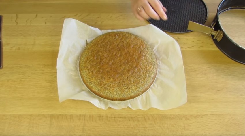 Корж, який випікся, акуратно вийняти з форми, але не знімати з поверхні пергаменту доти, доки його температура не зрівняється з кімнатною.![]()