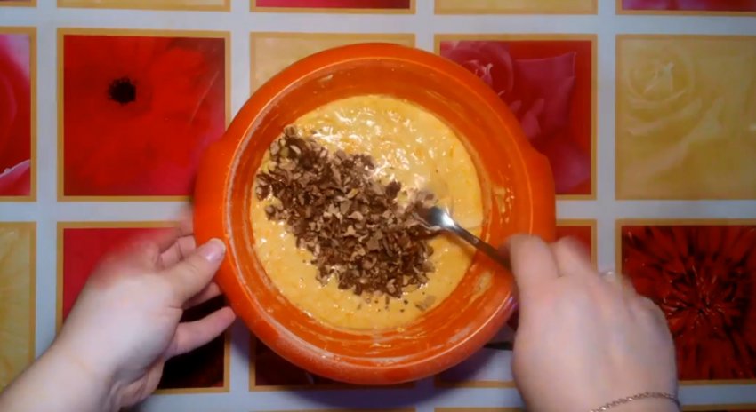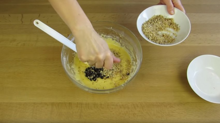 Після цього потрібно підмішати в тісто смажені рубані волоські горіхи.![]()