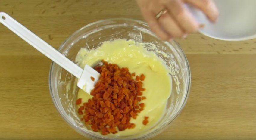 До складу тіста, призначеного для третього коржа, додати дрібно нарізану курагу і випекти корж.![]()