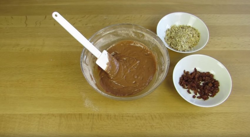 У четверте тісто з какао вмішати попередньо замочені родзинки і поставити випікатися.![]()