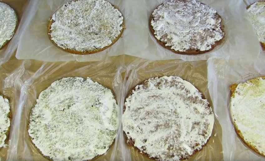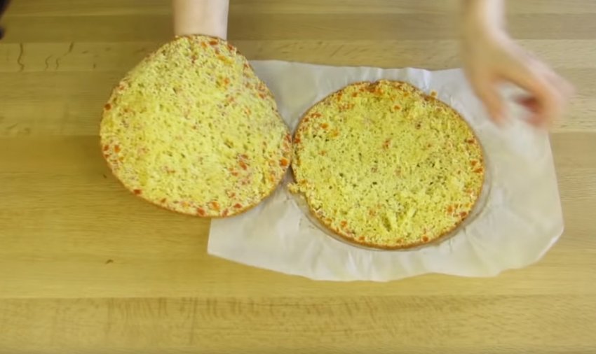 Після того як коржі повністю вистигнуть, з них слід зняти пергамент, після чого кожен з них розрізати на кілька частин. У результаті має вийти 8 складових для складання. Варто звернути увагу, що чим тоншим буде корж, тим швидше відбудеться процес їхнього просочення.![]()