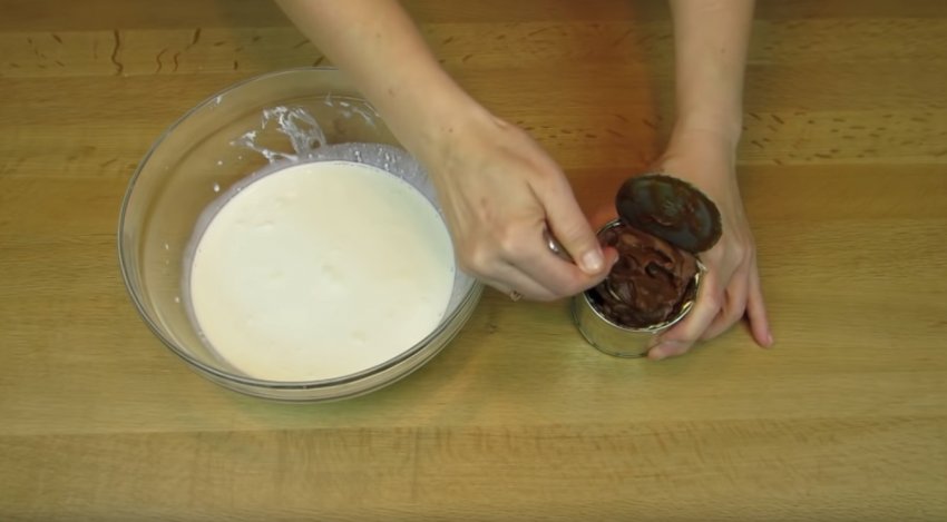 Для приготування крему майбутнього пирога спочатку слід збити вершки за допомогою міксера до утворення м'яких піків. В отриману суміш поступово ввести варене згущене молоко і обережно перемішати ці компоненти між собою.![]()