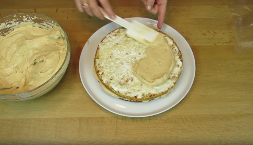 Після приготування крему необхідно промазати ним кожен корж і зібрати торт. Викладати коржі потрібно зрізом догори, оскільки саме на нього намазується крем. Останній корж покласти просоченням вниз.![]()