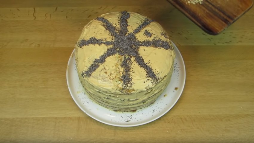 На останньому етапі торт трохи підрівняти. Борти і верх замазати кремом, який залишився, і придумати прикрасу, виходячи з власних уподобань.![]()