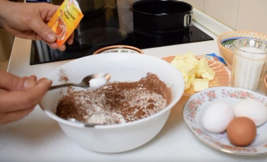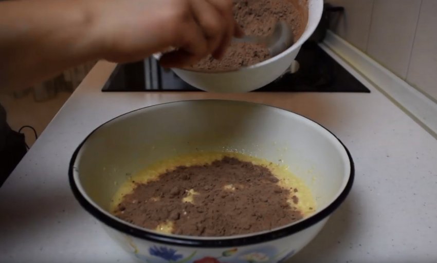 У велику миску всипати підготовлене борошно, до якого додати какао і все перемішати між собою. Сюди ж необхідно додати сіль із розпушувачем і ще раз добре перемішати.![]()
