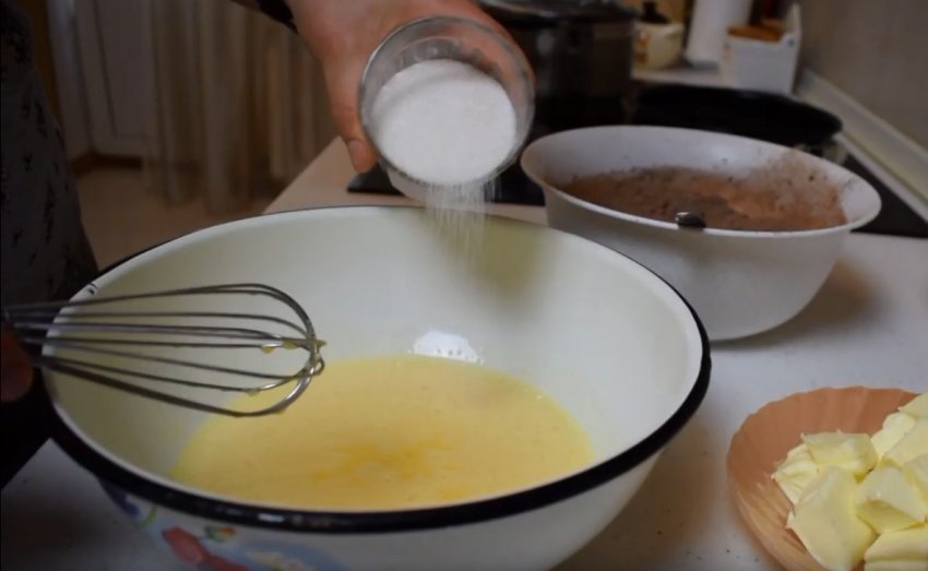 В окрему миску розбити яйця, які за можливістю мають бути кімнатної температури. Спочатку слід добре збити їх за допомогою вінчика, після чого в яєчну рідину підмішати ванільний цукор. Звичайний цукор потрібно вводити поступово, добре збиваючи вінчиком до його повного розчинення.![]()