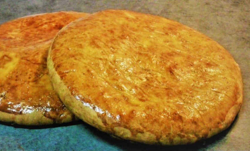 - Одну з частин розкачати за допомогою качалки в круглий корж, поверх якого викласти половину підготовленої начинки на середину. Вільні краї тіста, які залишилися, необхідно акуратно зібрати у вузлик, злегка притиснути і розкачати качалкою до отримання виробу з начинкою. За аналогічним принципом приготувати такий самий корж із другої половини тіста і начинки.