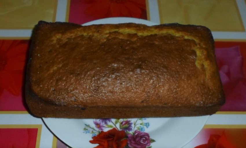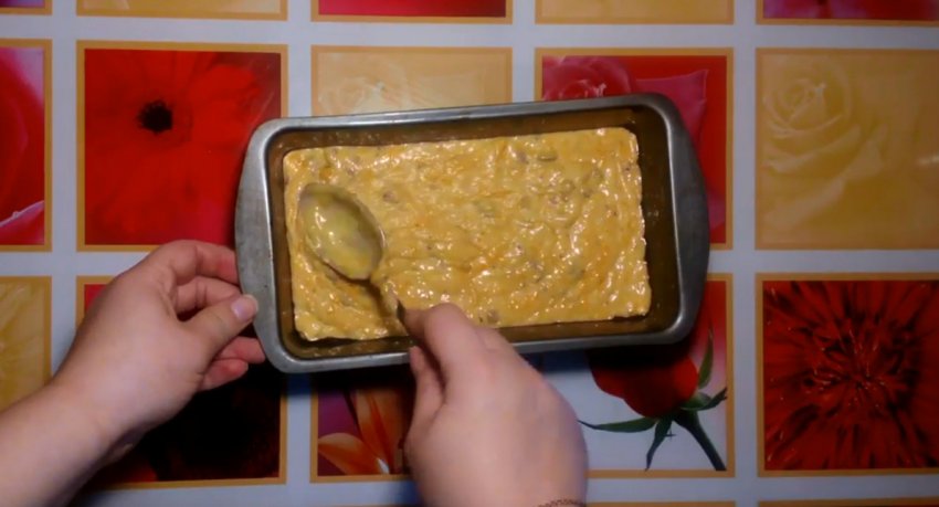 Взяти форму для запікання або ємність для кексу з параметрами 14×20 см, змастити олією і вилити туди підготовлене тісто, яке рівномірно розподілити. Поставити ємність у духовку з температурою +180°С на 30 хвилин.![]()