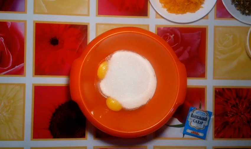 Узяти яйця і відокремити жовтки від білків. Для тіста знадобиться жовток, а для горіхової начинки - білок. До жовтків потрібно додати 2 ст. л. цукру і добре перетерти між собою ці інгредієнти.![]()