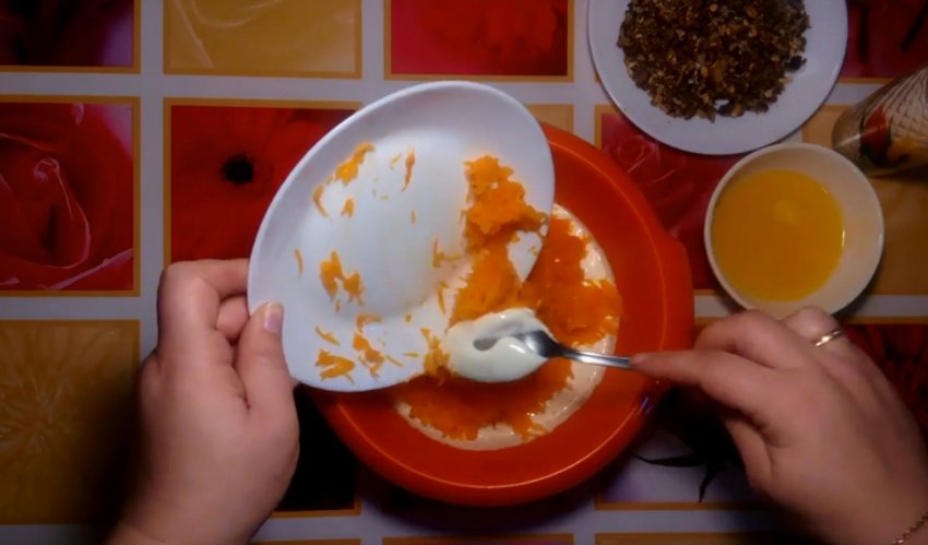 В отриману суміш потрібно додати сирий гарбуз, який попередньо натерти на дрібній тертці. Борошно, розпушувач, розтоплене вершкове масло ще раз змішати в міксері, щоб не було грудок, до отримання не надто рідкої консистенції.![]()