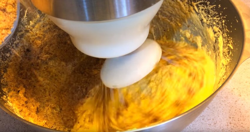 Окремо збити між собою цукор, що залишився, з білками і ввести в морквяно-горіхову суміш.![]()